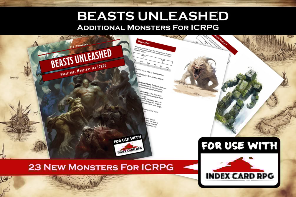 Immerse yourself in the dark, unexplored corners of your imagination with "Beasts Unleashed - Additional Monsters for ICRPG." This richly detailed guide serves as the perfect enhancement for any Index Card RPG (ICRPG) adventure, inviting you to breathe life into a vast array of monstrous creations.